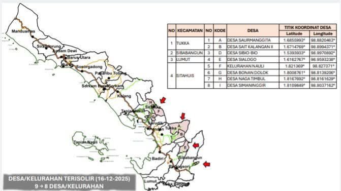 Sementara itu, dua desa berhasil keluar dari status desa terisolir yakni, Kelurahan Sipange (Kecamatan Tukka) dan Desa Hudopa Nauli (Kecamatan Kolang).