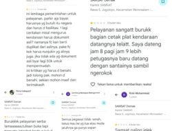 “Pelayanan sangat buruk, bagian cetak plat kendaraan datangnya telat. Saya datang jam 8 pagi, jam 9 lebih petugasnya baru datang dengan santainya sambil merokok,” tulisnya.