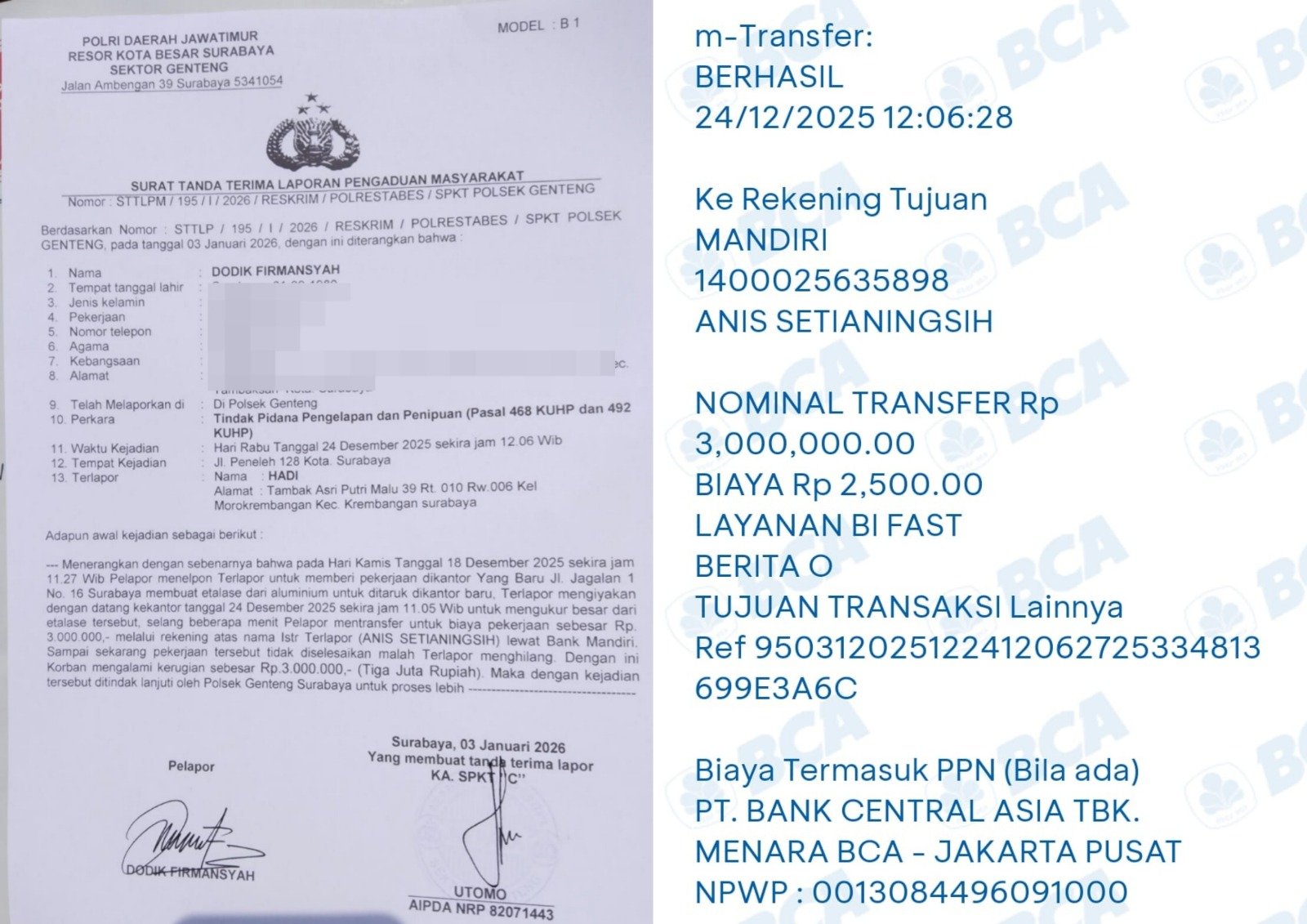 Selanjutnya, pada Selasa, 24 Desember 2025, terlapor datang ke lokasi kantor pelapor di Jalan Jagalan I Nomor 16 Surabaya untuk melakukan pengukuran etalase. Beberapa menit setelah pengukuran, pelapor mentransfer uang sebesar Rp3.000.000 sebagai biaya pekerjaan melalui rekening atas nama Anis Setianingsih, yang disebut sebagai istri terlapor, melalui Bank Mandiri.